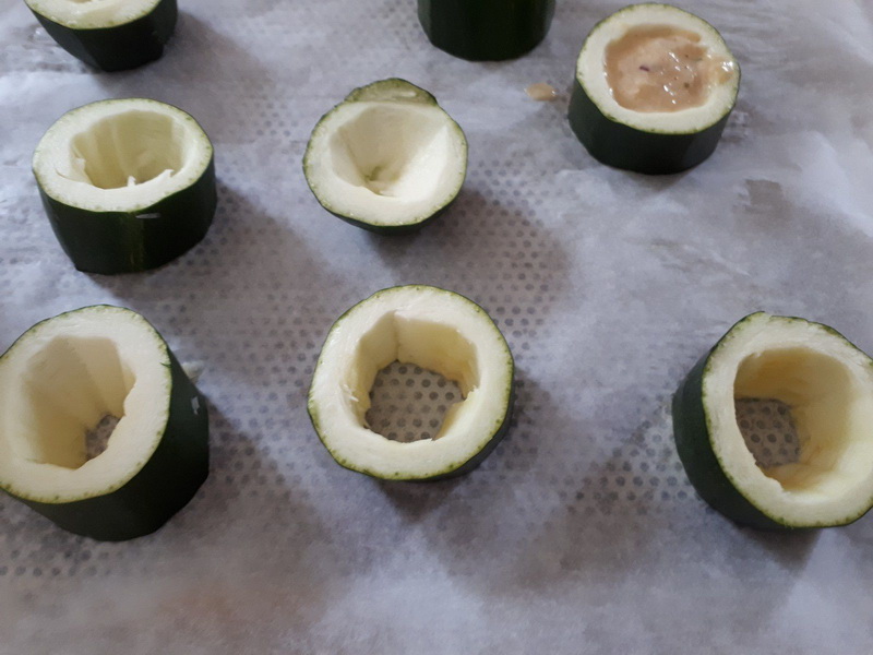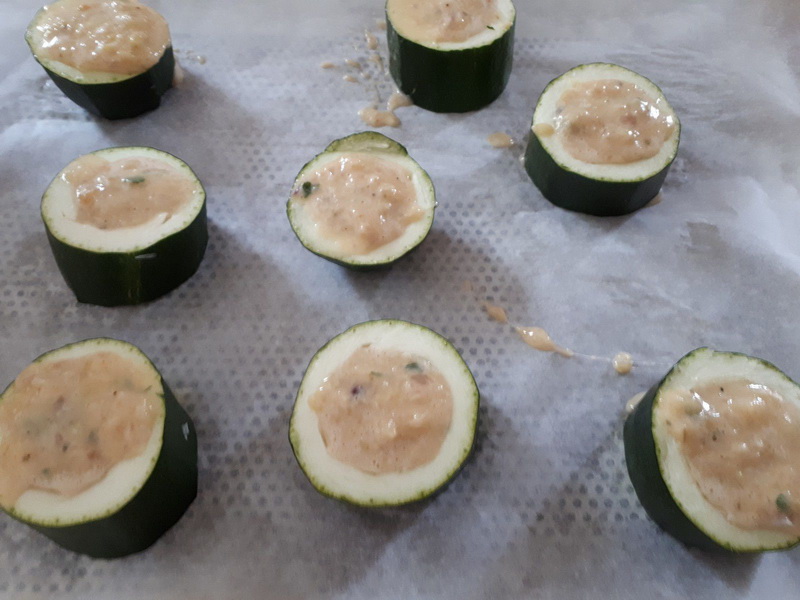- Disposer dans un plat allant au four et sur une feuille de papier sulfurisé les rondelles de courgettes. Verser la farce à l’intérieur.