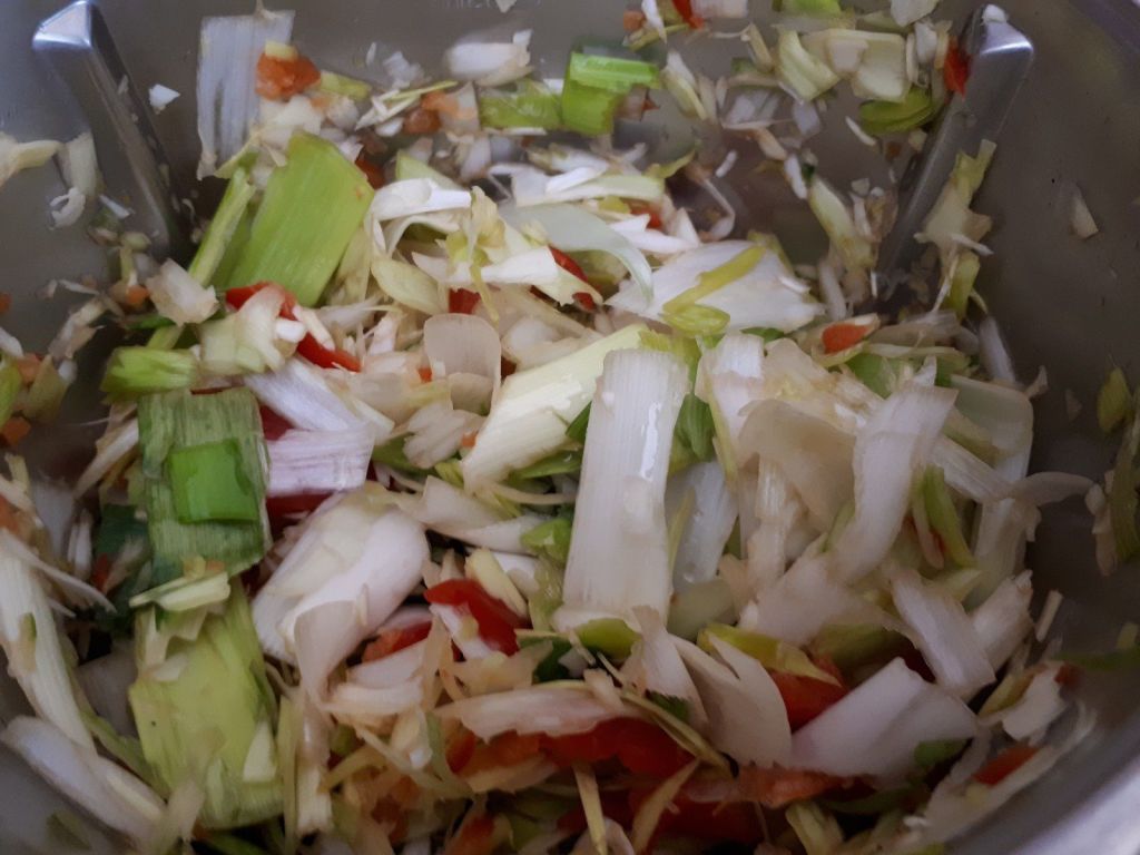 - Laver et éplucher les poireaux, le couper finement, faire de même avec le poivron, les faire revenir environ 10 minutes avec de l’huile d’olive dans une sauteuse.