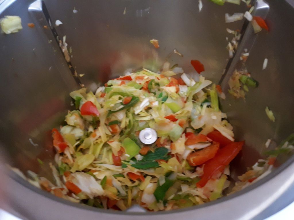 - Placer les morceaux de poireaux et le poivron dans le bol et mixer 5sec/vit5.