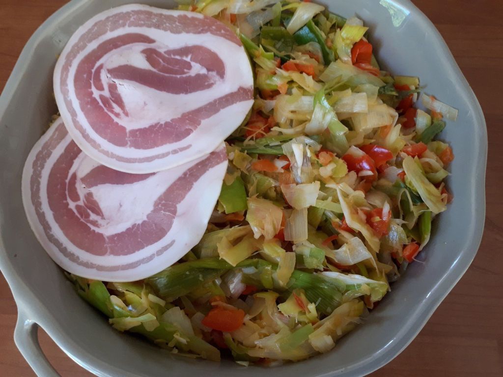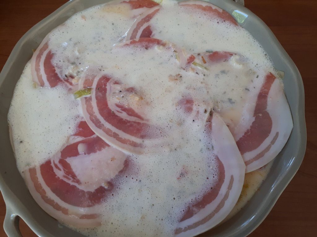 - Débarrasser l’ensemble dans un plat à gratin puis disposer les tranches de pancetta sur le dessus.