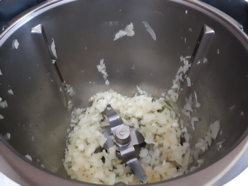 - Verser l’huile et faire rissoler 4min/120°C/vit mijotage (Varoma pour le TM31) sans le gobelet doseur.