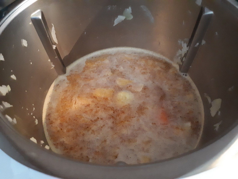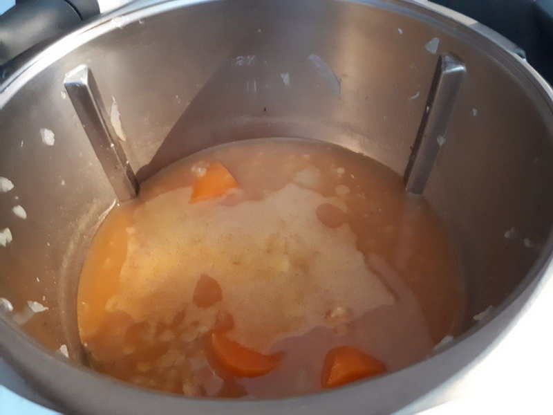 - Ajouter les carottes pelées et coupées en rondelles, l’eau, et le cube de bouillon, chauffer 4min100°C/couteau inversé/vitesse mijotage.