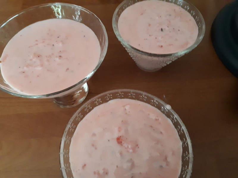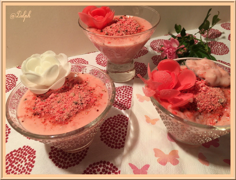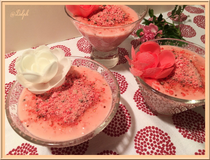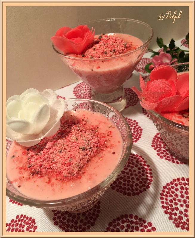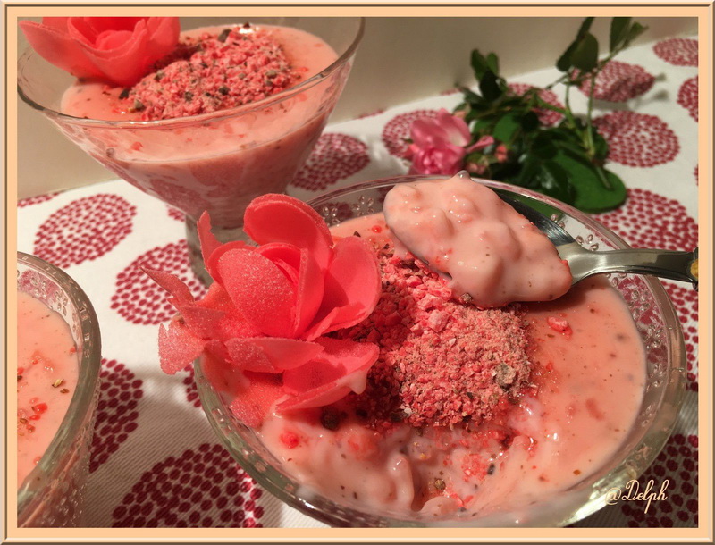 J’ai trouvé des pralines roses, qui étaient au fond de mon tiroir à pâtisserie, j’avais envie de les utiliser dans un bon riz au lait..En cherchant sur la toile j’ai trouvé la recette chez mon amie Josette..Je l’ai un peu simplifiée en enlevant les fraises, et l’eau de rose.