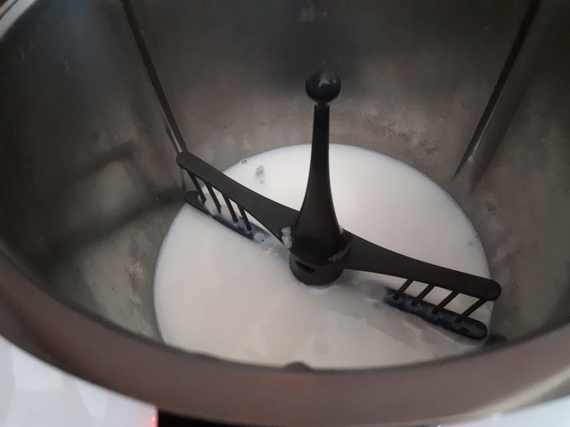 - Insérer le fouet, verser le lait et le riz dans le bol, faire chauffer 5mn/varoma/sens inverse/vitesse 1.