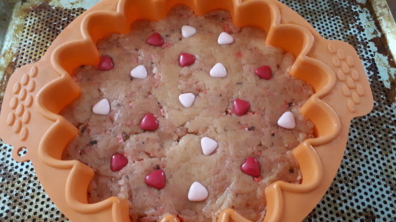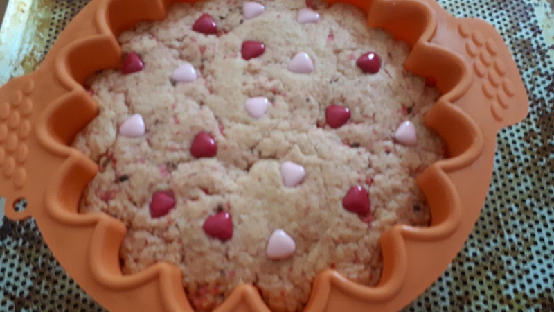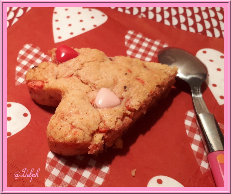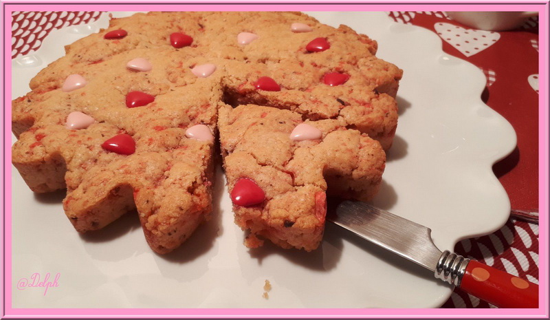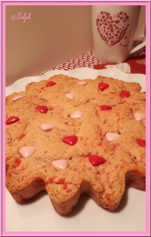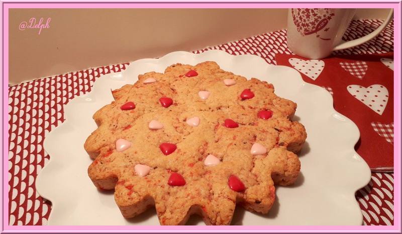 Pour cette recette je me suis largement inspirée de la recette de sablé géant aux spéculoos, de ma chère Julia, j’ai mis des biscuits roses à la place des spéculoos et mis des pralines à la place des pépites …