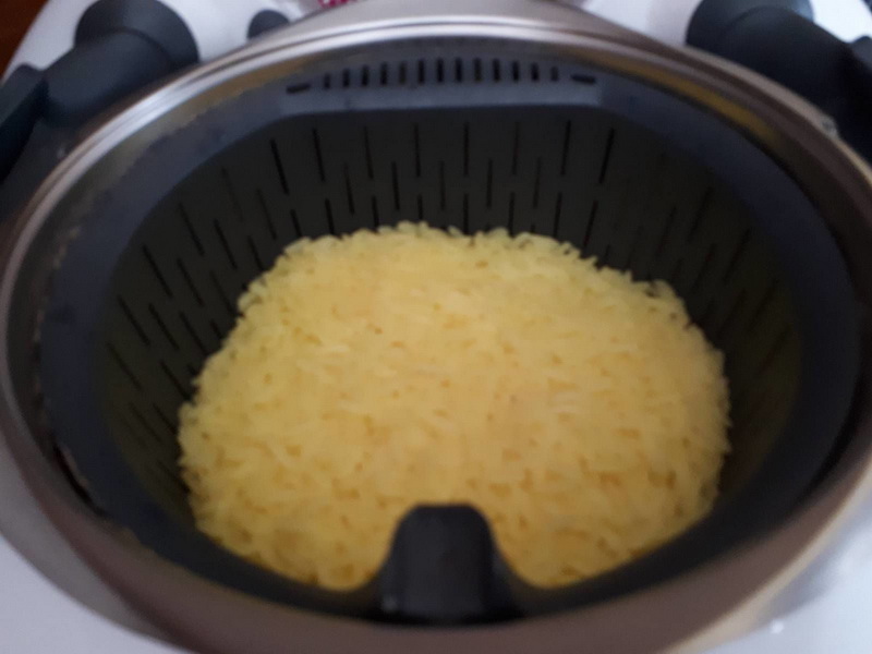 - Mettre dans votre bol, l’eau, le sel, la dose de safran, déposer votre panier cuisson puis peser votre riz, mélanger avec la spatule. Fermer le couvercle avec le gobelet doseur puis programmer 17min/100°C/vit4. A la sonnerie, sortir le panier à l’aide de la spatule, réserver au chaud.