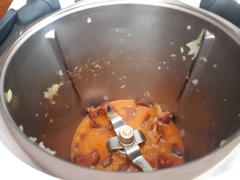 - Pendant ce temps haché grossièrement le chorizo, le déposer dans le bol avec le vin blanc puis faire chauffer 5 min/90°C/vit2.