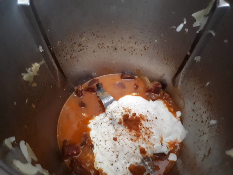 - Ajouter la crème, du sel du poivre, le paprika puis faire chauffer 3min/90°C/vit2, à la sonnerie mixer 30sec/vit9.