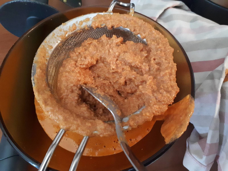 - Prendre un chinois (une passoire) et passer la sauce en pressant fortement la chair du chorizo pour extraire le maximum de sauce.