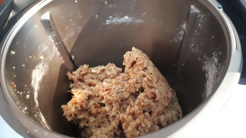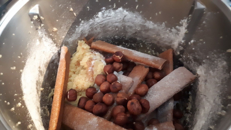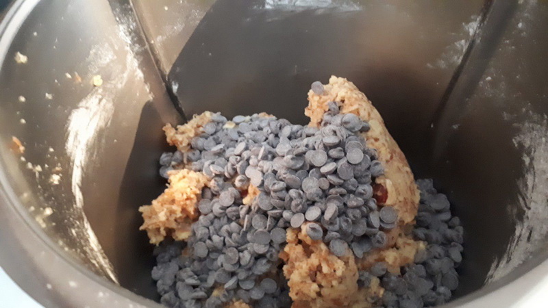 - Ajouter les noisettes et les gavottes puis mélanger 40sec/vit3, enfin incorporer les pépites de chocolat puis mélanger 20sec/couteau inversé/vit3.
