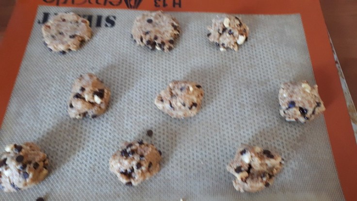 - A l’aide d’une cuillère à glace, confectionner des boules de pâte et les disposer sur une plaque de cuisson recouverte de papier sulfurisé en veillant à bien les espacer. Les aplatir légèrement avec la paume de la main.