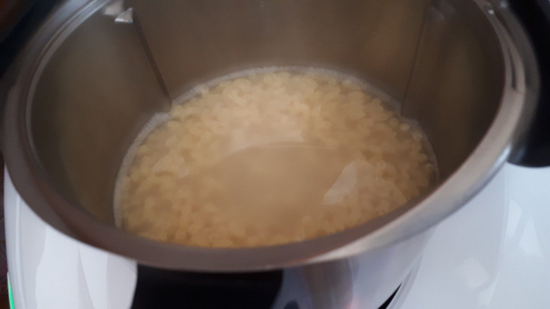 - Mettre 1200g d’eau dans le bol et faire chauffer 10min/100°C/vit1, à la sonnerie, ôter le gobelet, mettre 1,5 c à c de sel puis vos coquillettes et poursuivre 9min/100°C./vit 1 sans le gobelet. Égoutter vos pâtes et réserver.