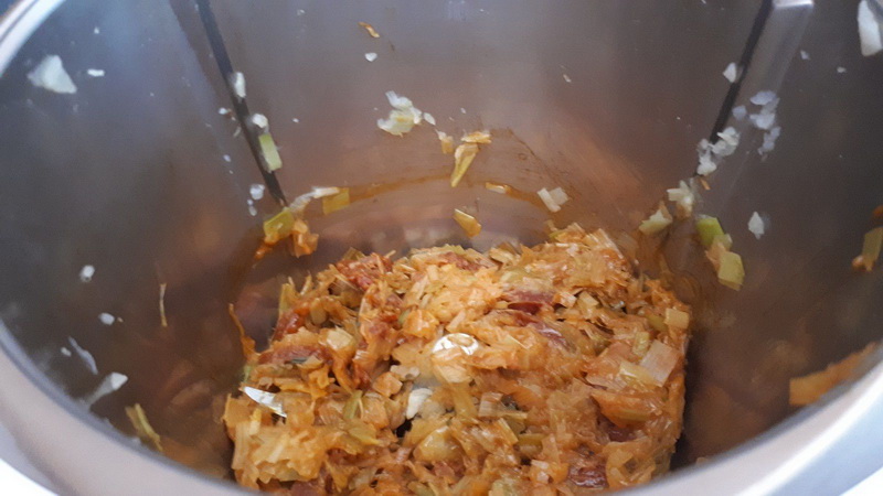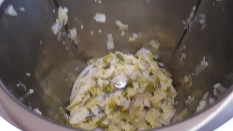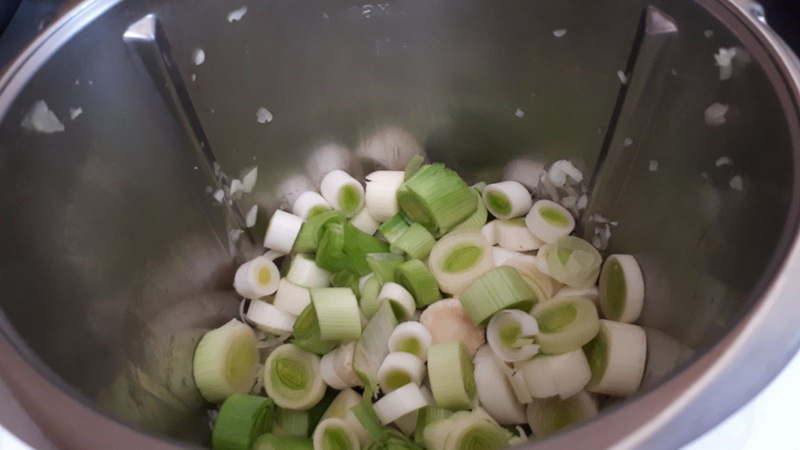 - Éplucher et couper votre oignon en deux, dégermer vos gousses d’ail, mettre l’oignon et l’ail (ou pâte d’ail) dans le bol et mixer 5sec/vit5, ajouter 1 c à s d’huile d’olive, vos poireaux lavés et coupés en rondelles puis programmer 3’30min/120°C/couteau inversé/vit1. A la sonnerie, ajouter 1,5 gobelet d’eau soit 150g d’eau, assaisonner et programmer 18min/120°C/couteau inversé/vit1, à la sonnerie, (si vous trouvez que vos poireaux ont rendu trop d’eau vous pouvez enlever l’excès de jus, moi ce n’était pas le cas),. ajouter le chorizo coupé en fines rondelles puis poursuivre la cuisson 2min/100°/couteau inversé/vit1.