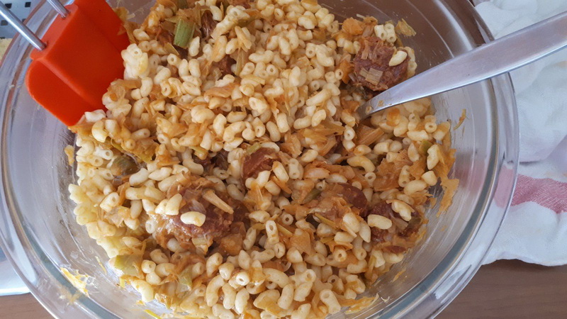 - Mélanger cette préparation aux coquillettes.