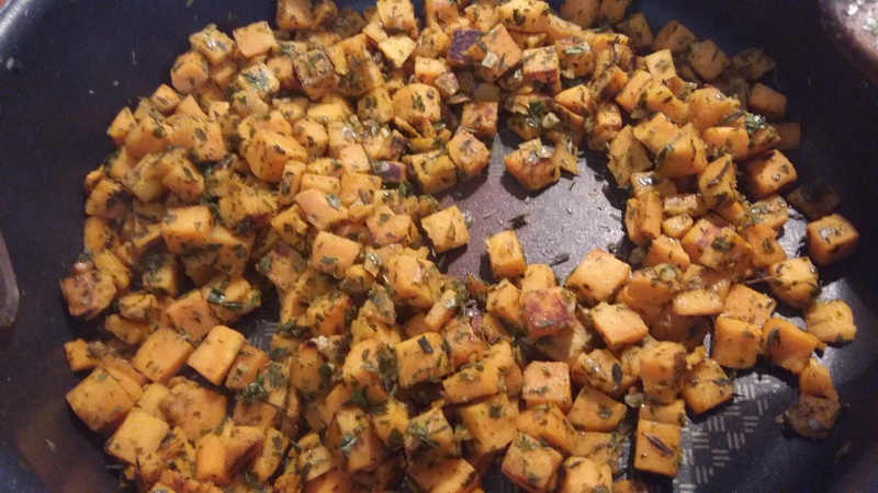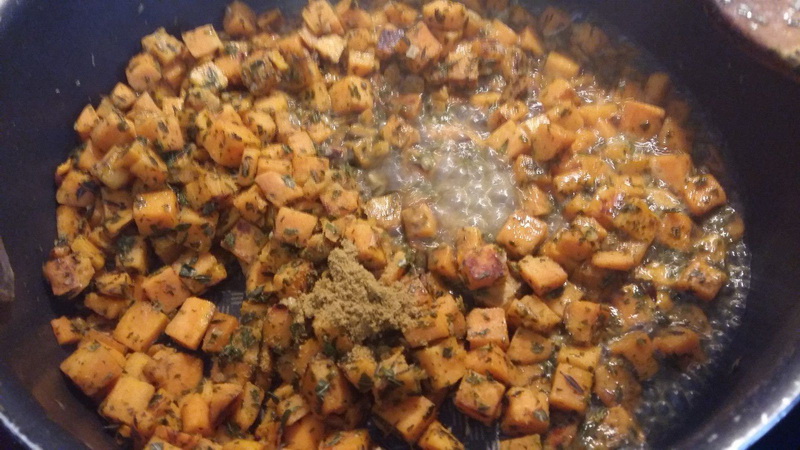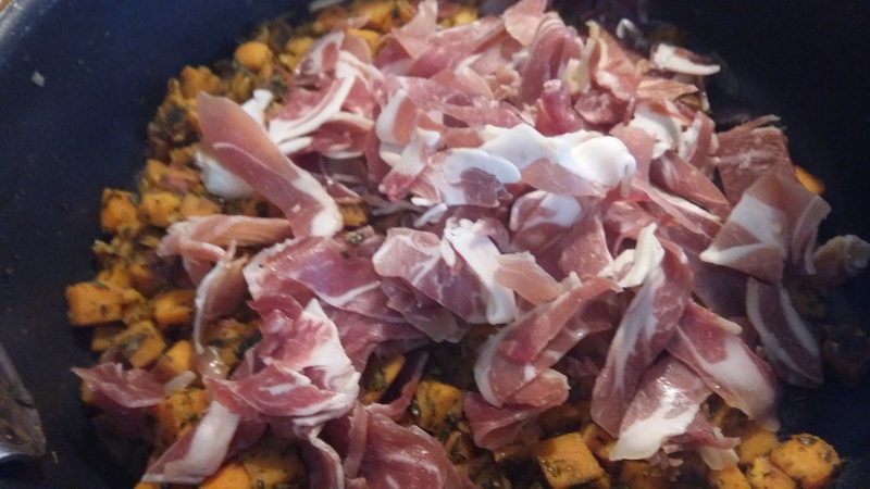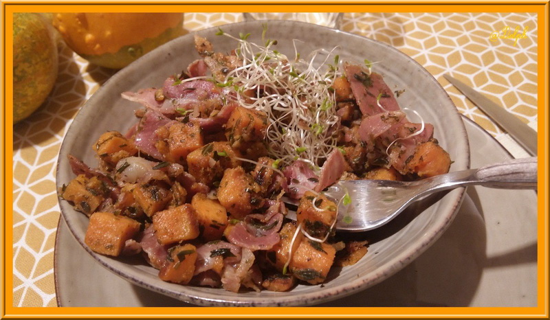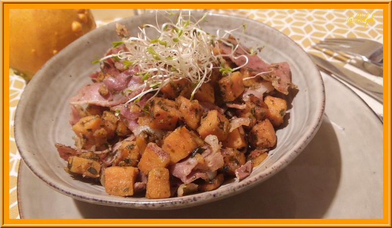 Voici une petite poêlée toute simple qui m’a permis d’utiliser un reste de pétale de jambon sec et une petite patate douce qui trainait dans le garage.