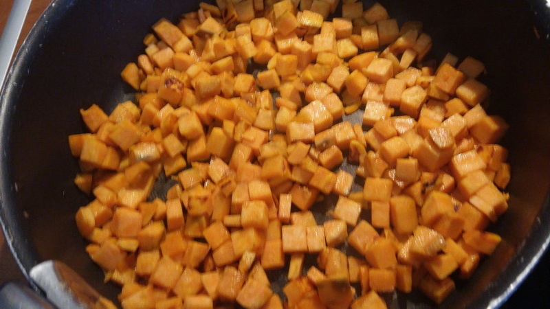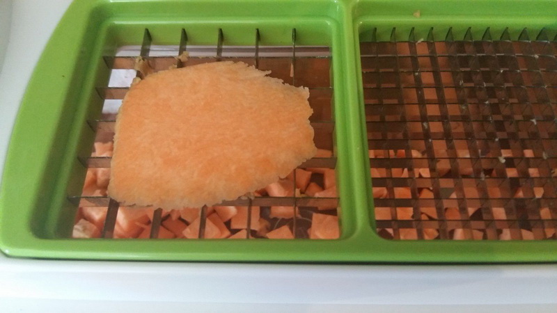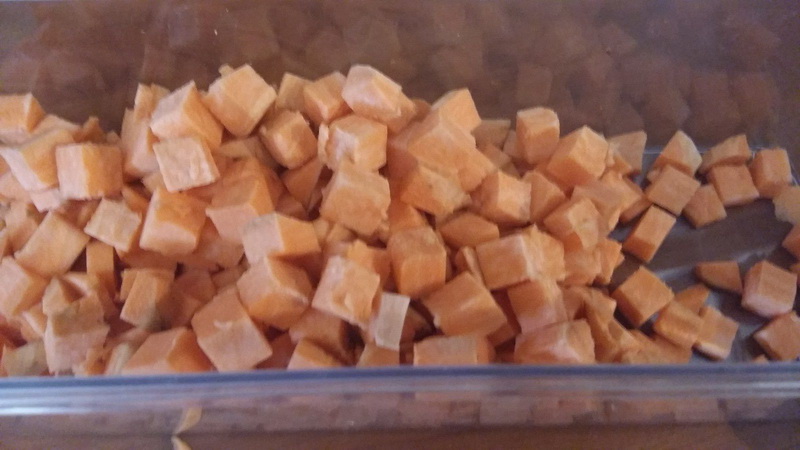 - Laver, éplucher votre patate douce et le couper en petits cubes, je me suis aidée de mon coupe légumes pour avoir des cubes réguliers.