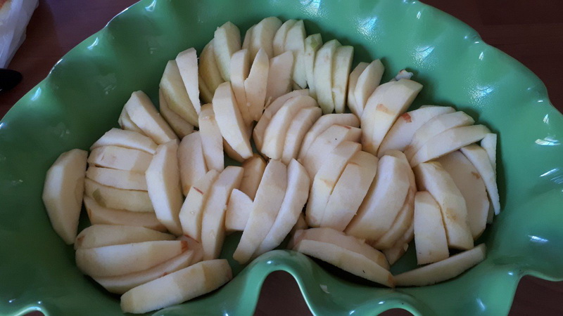 - Peler et couper les pommes en morceaux et les répartir au fond d’un moule.
