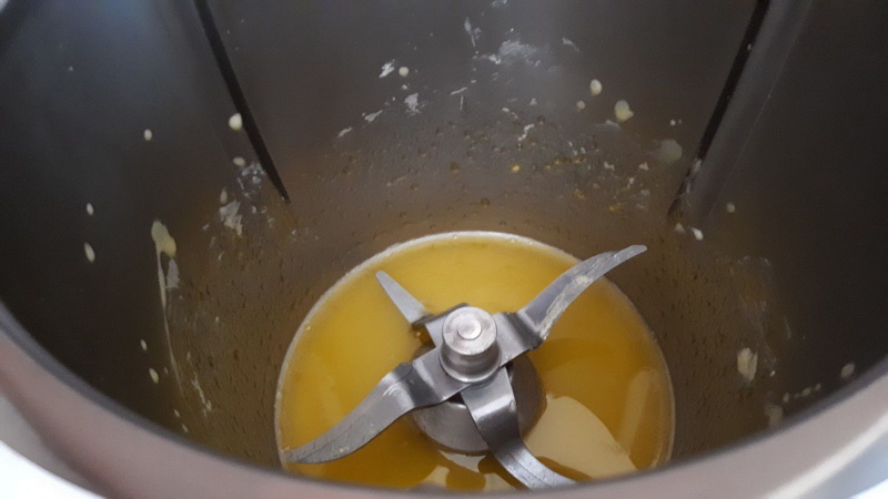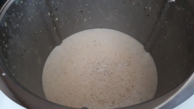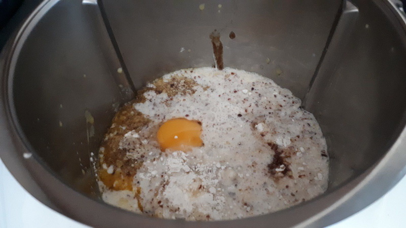 - Mettre dans le bol du Thermomix le beurre coupé en morceaux et faire fondre 1min30/90°C/vit2, ajouter la farine, la poudre de noisettes, le sucre, les œufs, le lait et mélanger 40sec/vit4.