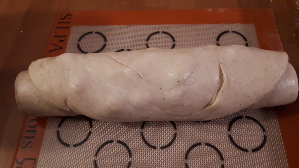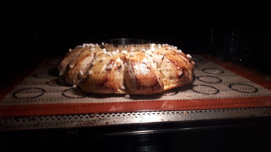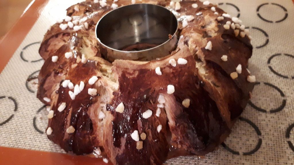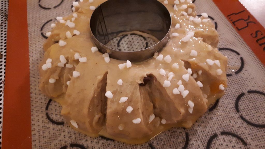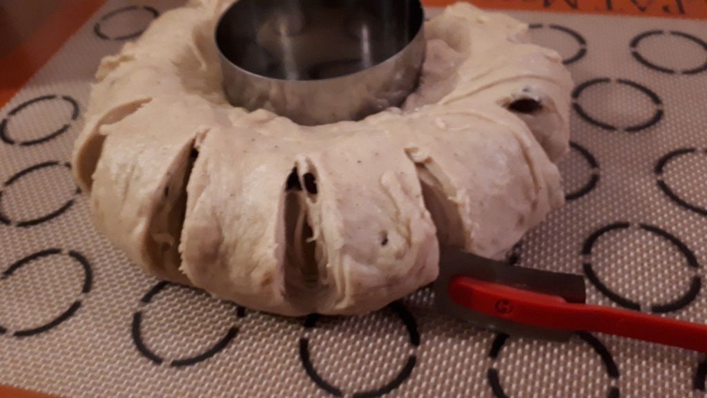 - Rouler la pâte en boudin long et faire un anneau que vous fermerez. Placer le sur une plaque couverte de papier de cuisson. Couper (cranter) le pourtour, couvrir d’un torchon propre et laisser pousser 30 minutes. Badigeonner au jaune d’œuf.