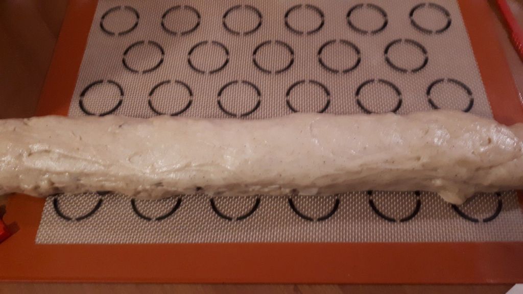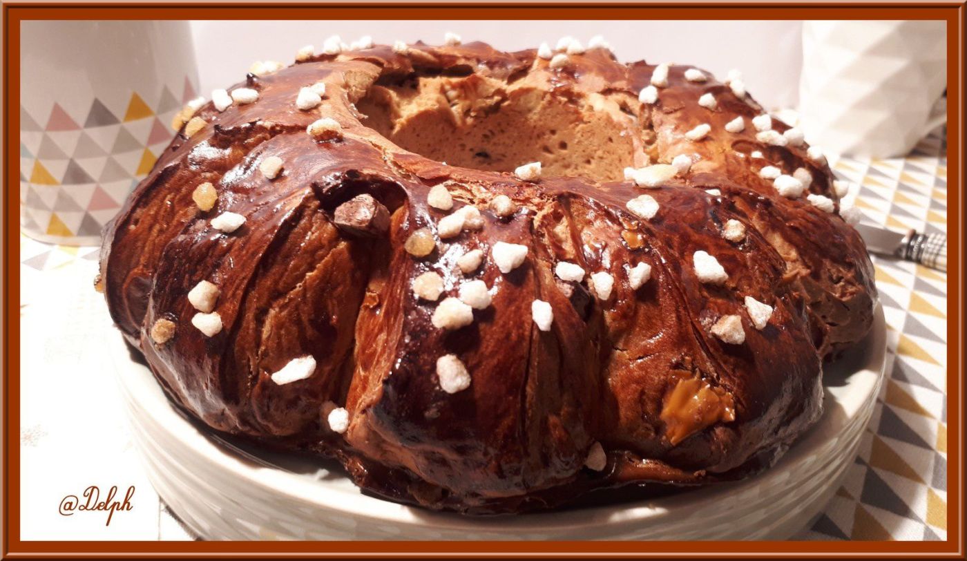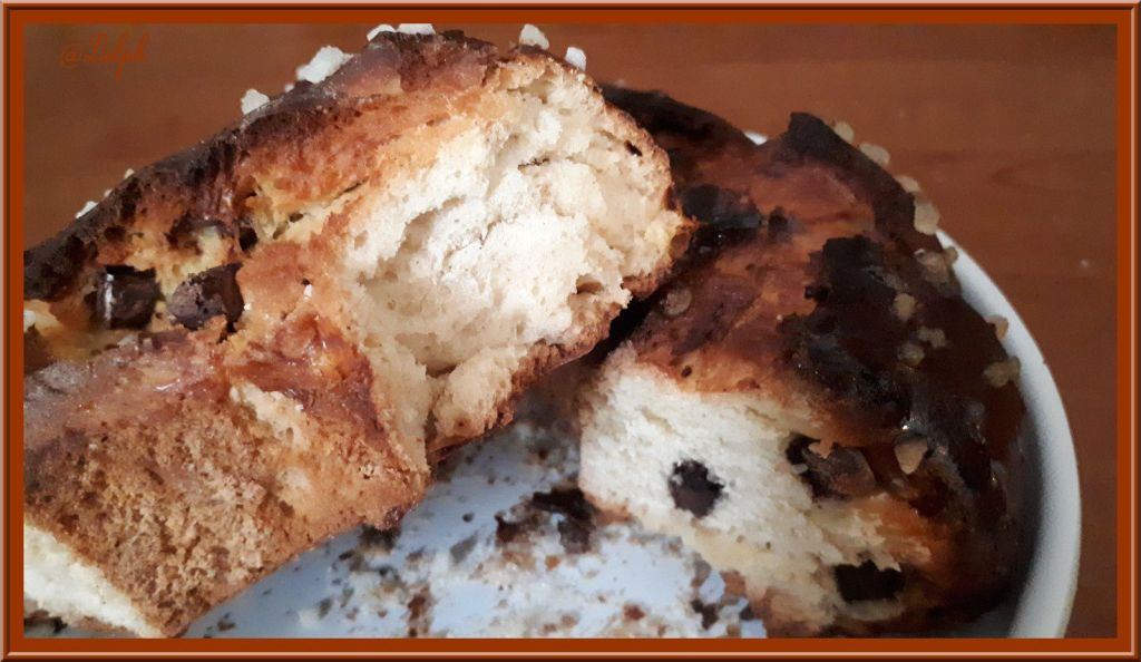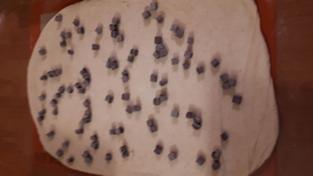 - Aplatir la pâte en rectangle et parsemer la de pépites de chocolat. Rouler la pâte en boudin long et faire un anneau que vous fermerez.