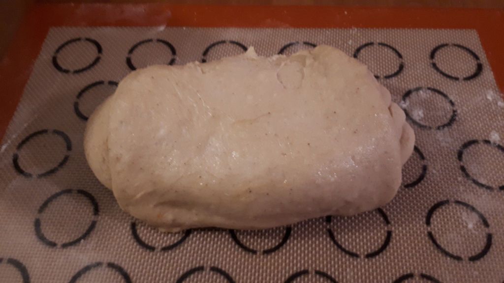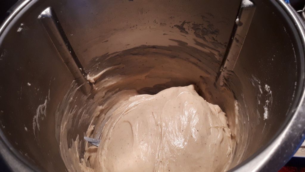 - Pétrir au robot pendant 10 minutes environ. Il faut obtenir une pâte lisse molle et non collante (la mienne était molle mais encore collante, j’ai ajouté un peu de farine).