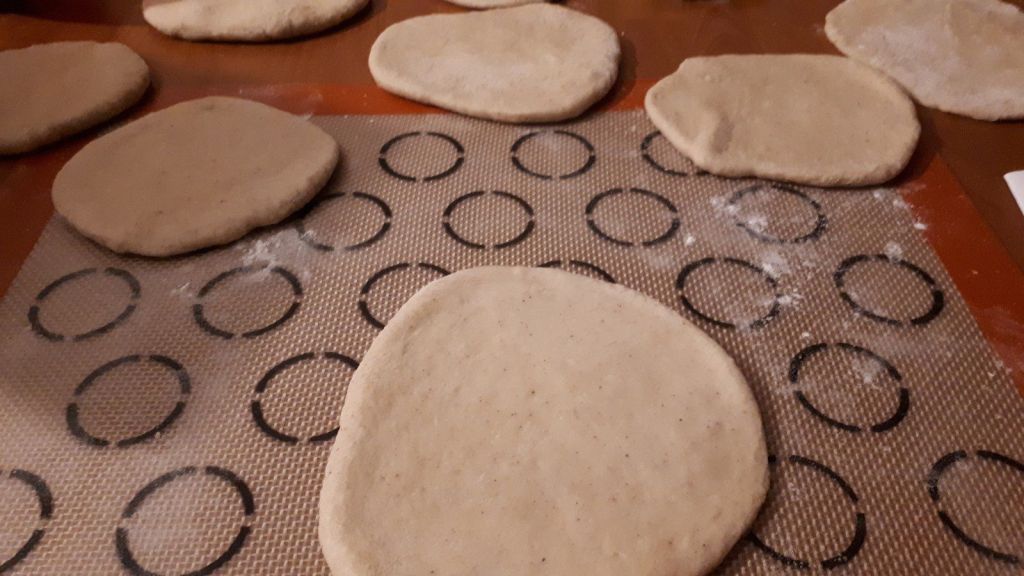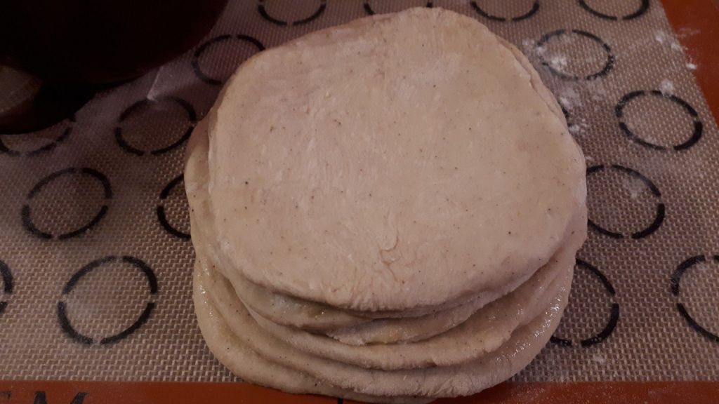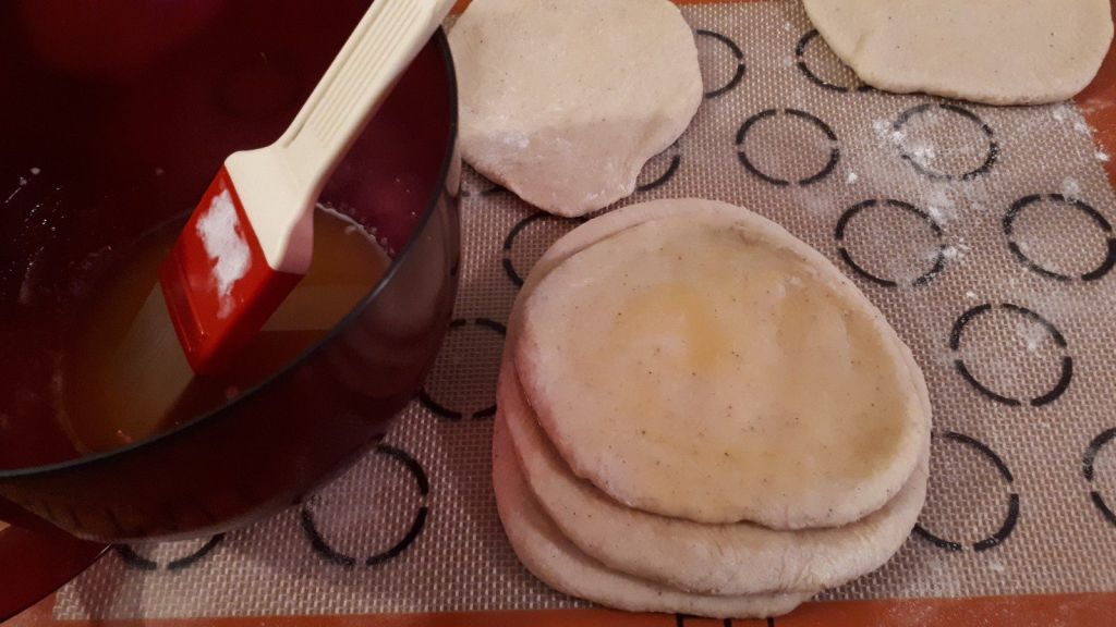 - Retirer la pâte, fariner votre plan de travail. Dégazer la pâte et former 10 boules. Laisser reposer 15 minutes Les aplatir ensuite sur 1 cm d’épaisseur et les badigeonner au pinceau de beurre fondu.