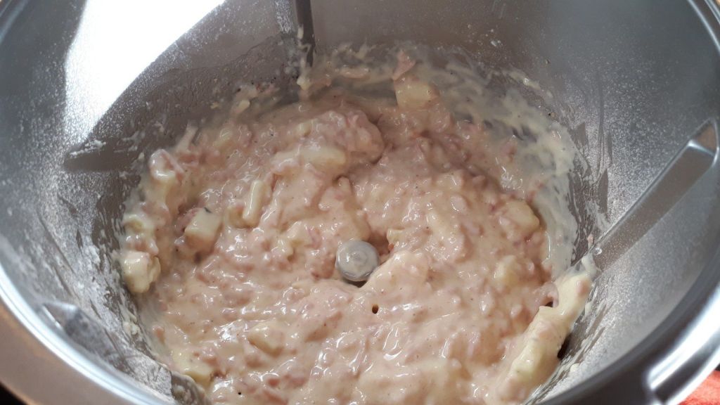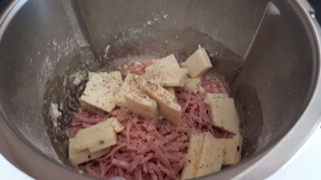 - Mettre dans le bol les œufs, la farine, la levure, le lait, l’huile puis mélanger 40sec/vit4, ajouter le râpé de jambon, le fromage à raclette coupé en petits dés, le sel, le poivre et l’ail en poudre puis mixer 30sec/couteau inversé/Vit3.