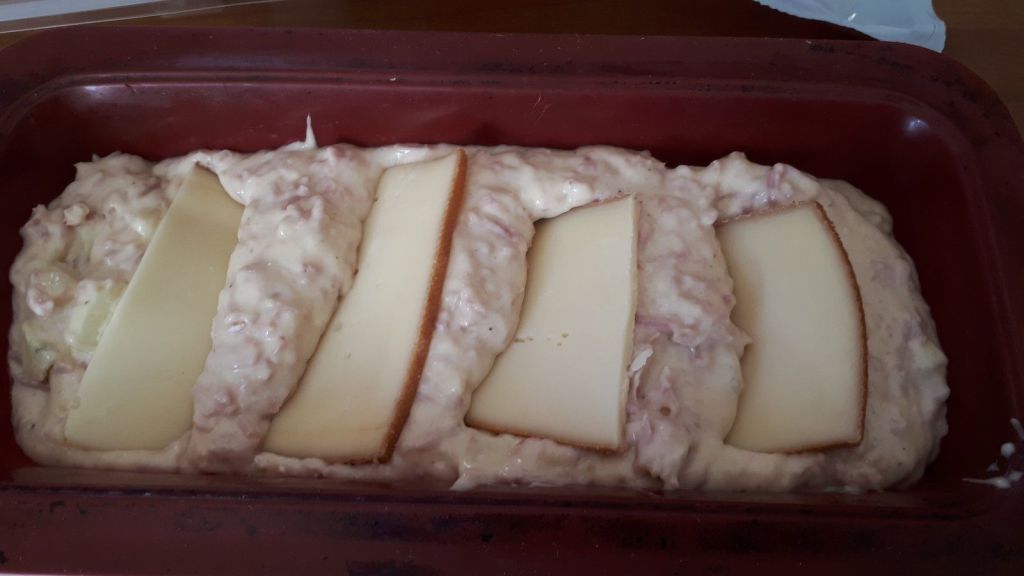 - Verser la préparation dans un moule à cake beurré, ajouter des tranches de fromage sur le dessus.