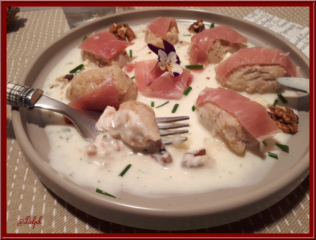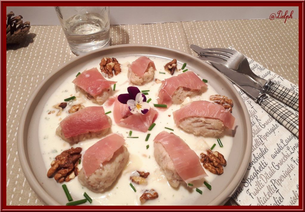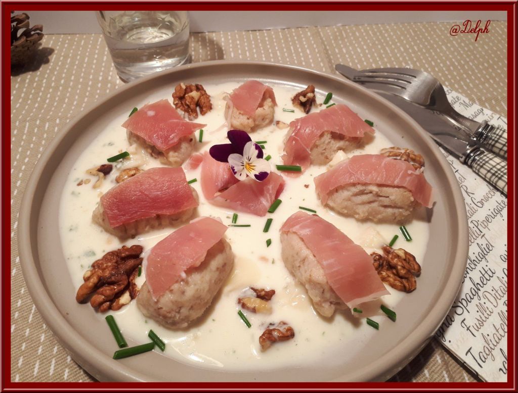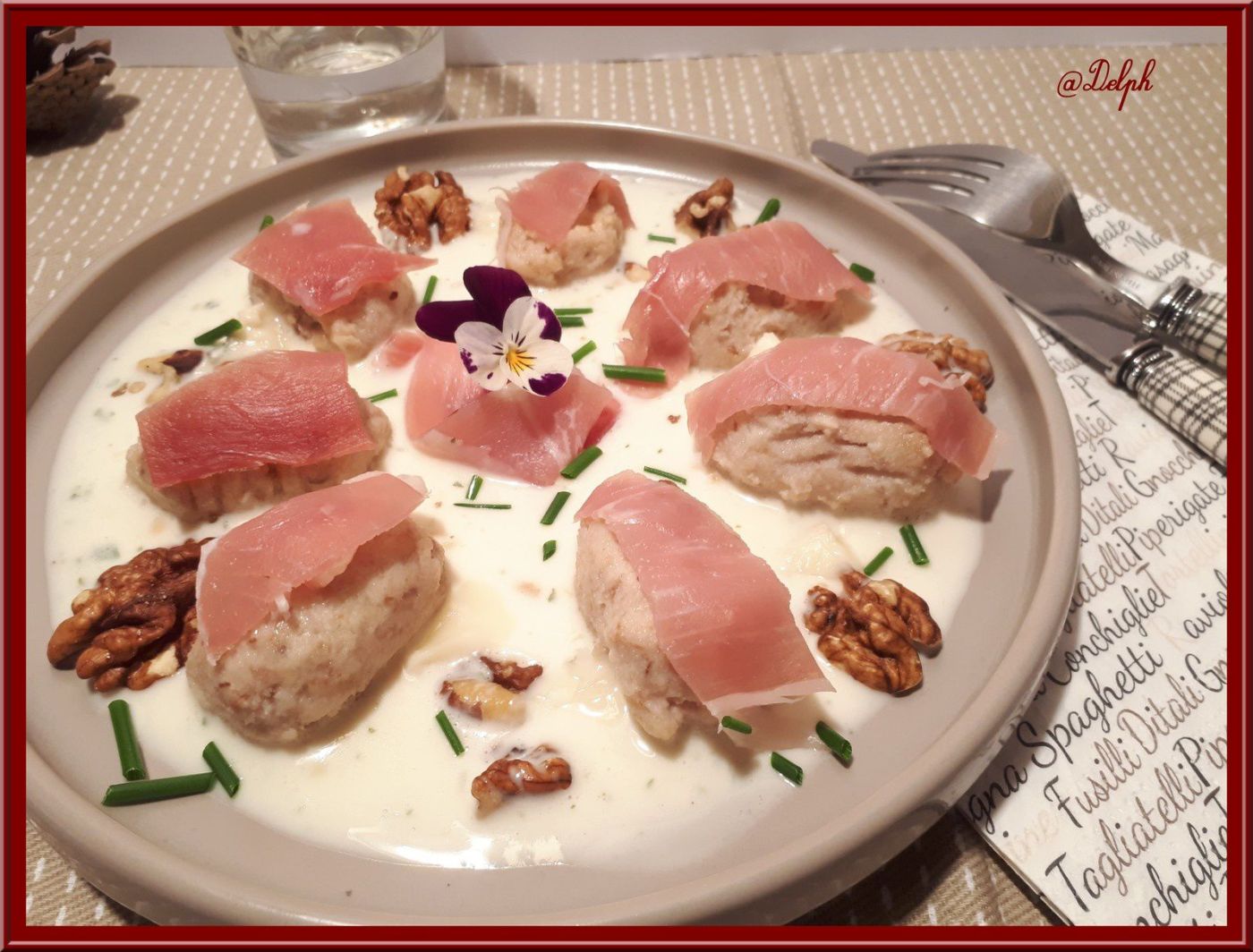 - Dresser vos assiettes, en déposant votre crème au fond, disposer quelques gnudi, parsemer de petits bouts de gorgonzola, mettre quelques cerneaux de noix pour la touche croquante, puis sur chaque gnudi déposer une petite lamelle de jambon cru.