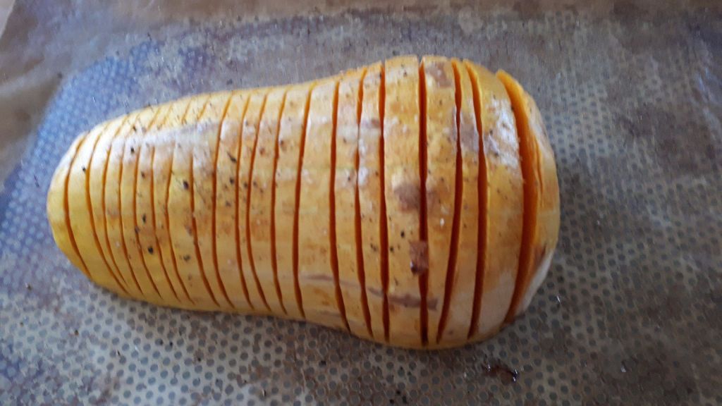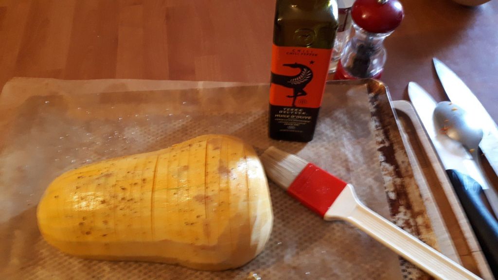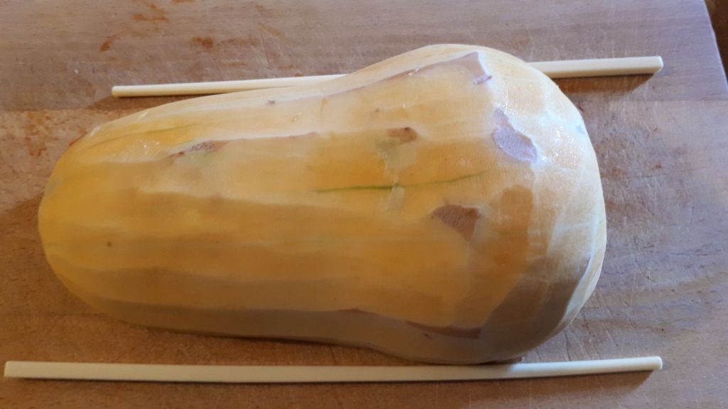 - Couper votre Butternut en 2 dans le sens de la longueur, l’éplucher et enlever les graines. Placer une baguette chinoise de caque côté puis avec un bon couteau, faire des entailles.