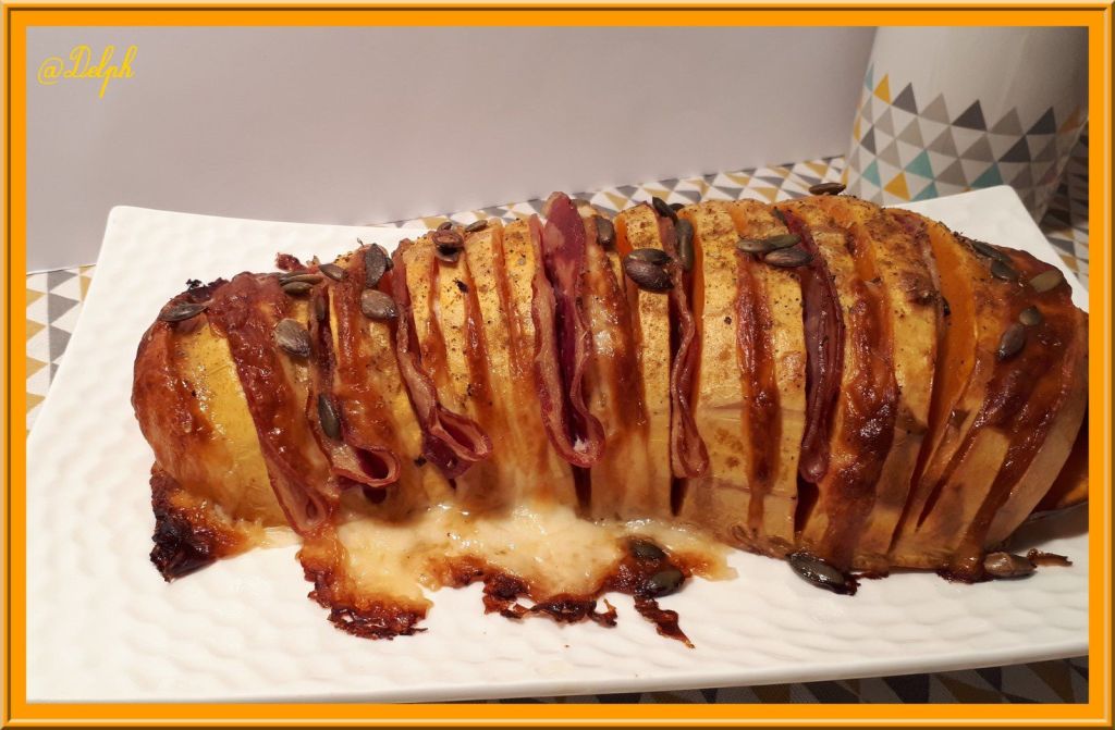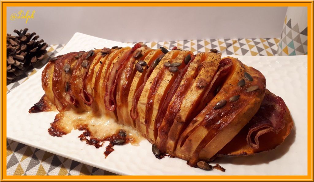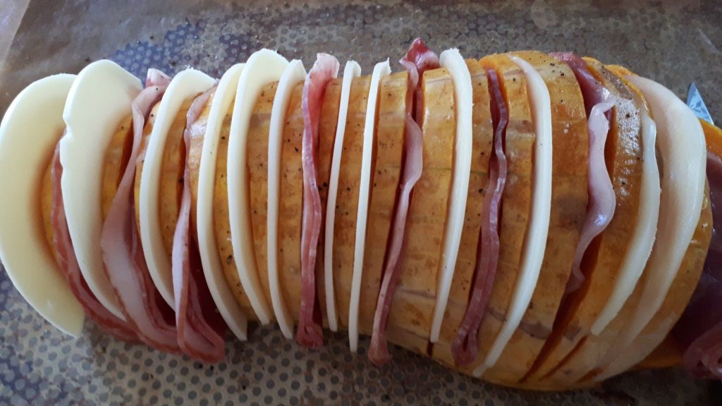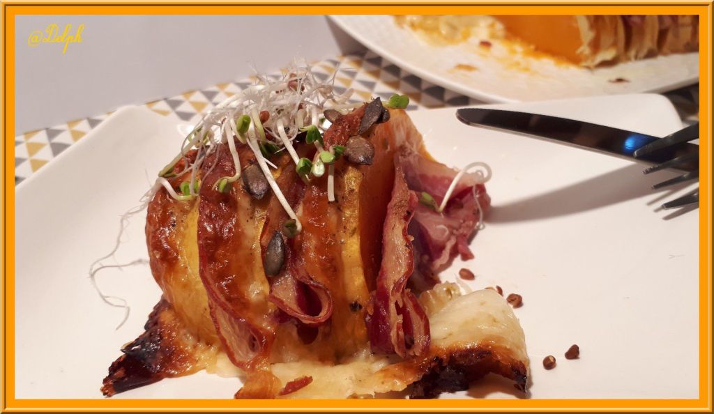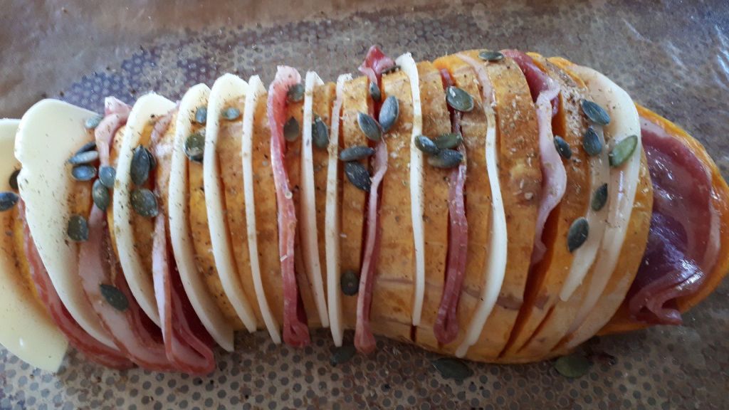 - A la sortie du four, insérer entre les lamelles de butternut des tranches de pancetta en alternant avec des tranches de mozzarella. Assaisonner avec du sel, du poivre, du cumin et de l’origan, parsemer quelques graines de courges.