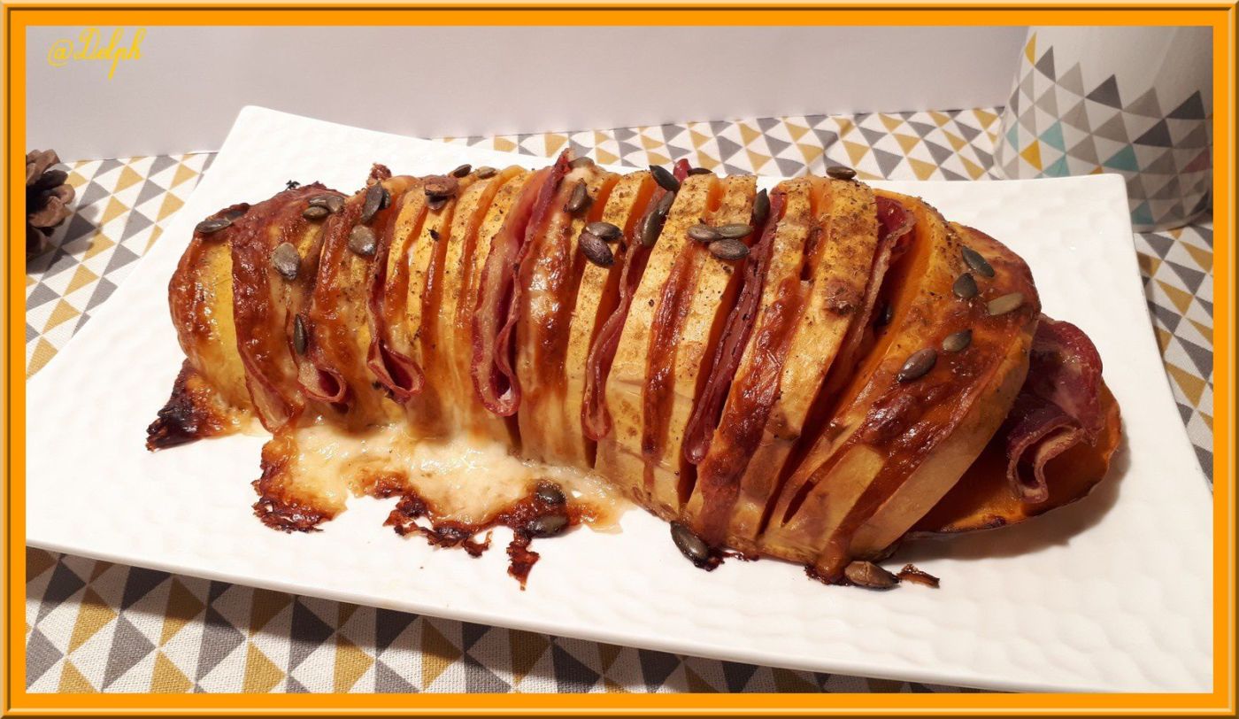 - A la sortie du four, insérer entre les lamelles de butternut des tranches de pancetta en alternant avec des tranches de mozzarella. Assaisonner avec du sel, du poivre, du cumin et de l’origan, parsemer quelques graines de courges.