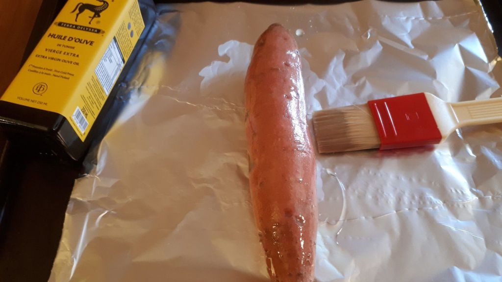 - Préparer deux grandes feuilles d’aluminium, placer une patate douce dans chaque aluminium, les badigeonner généreusement d’huile d’olive, fermer l’aluminium.