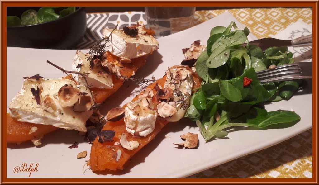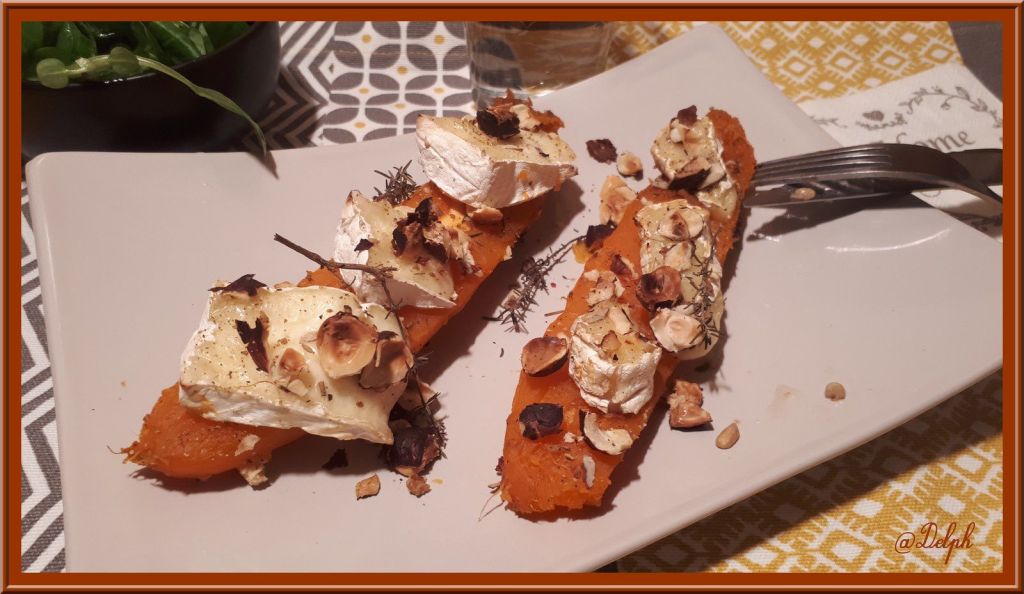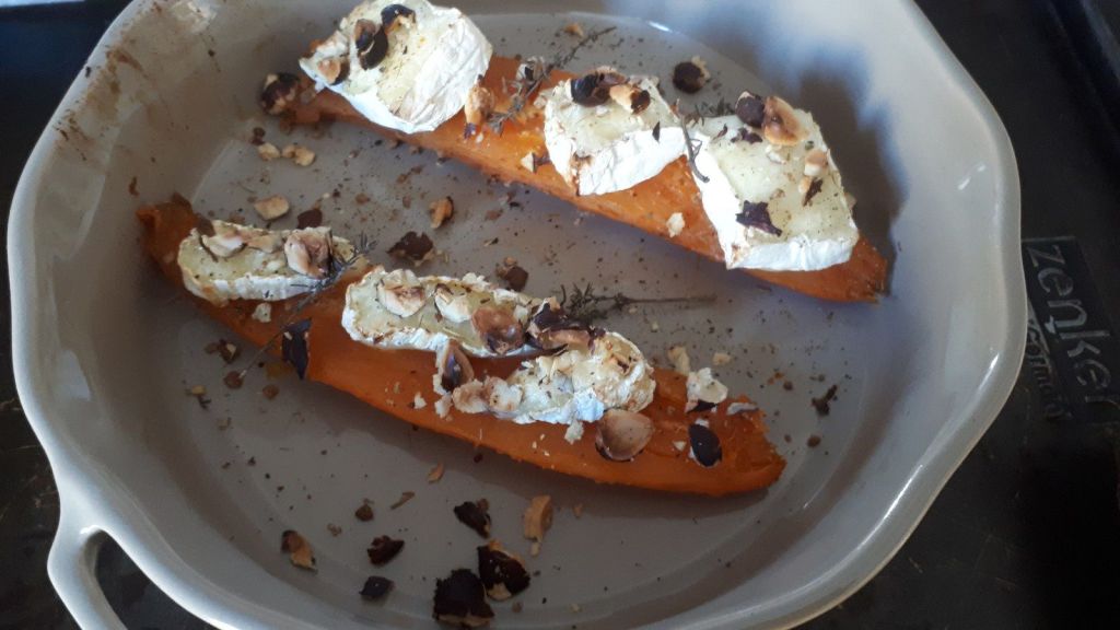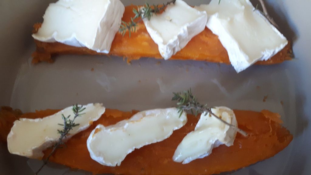 - Les ouvrir en deux en les coupant dans le sens de la longueur, placer 3 parts de camembert sur chaque demie patate douce.