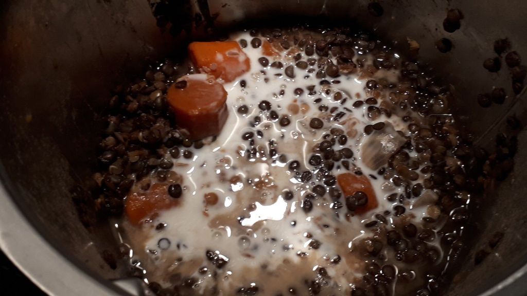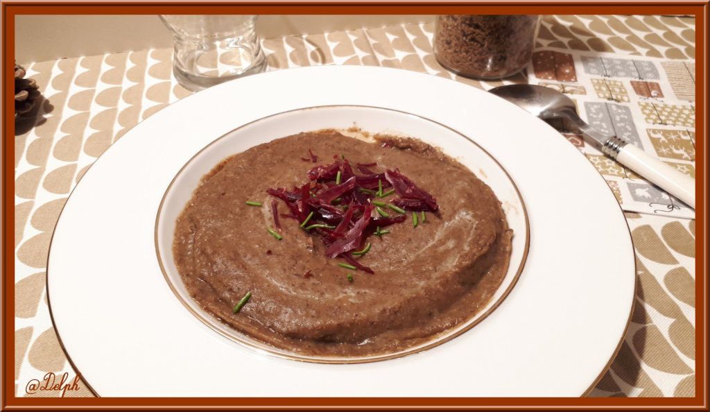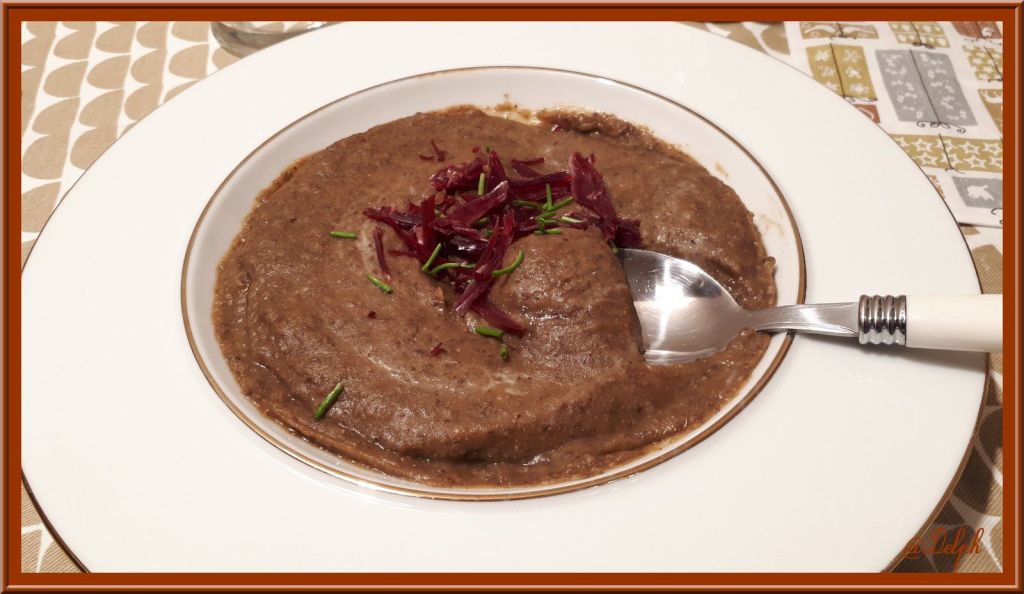 Voici un délicieux velouté, il est très savoureux, moi qui aime les lentilles, je trouve que c’est une bonne façon de les manger. C’est une recette de chez Aude Cuisine, j’ai ajouté un oignon et mis du bœuf séché à la place du bacon, vous pouvez ajouter de l’eau si vous souhaitez que cela soit moins épais.