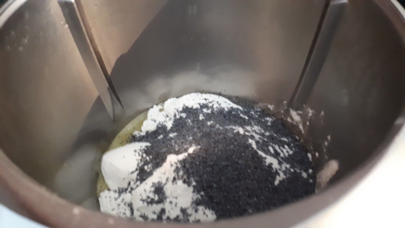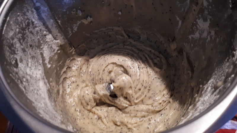 - Une fois le mélange refroidi ajouter la farine, la levure, les graines de pavot et le sel puis mélanger 30sec/vit4. La pâte est un peu collante c’est normal. Transvaser dans un saladier, couvrir et mettre au frais pendant au minimum 2h.