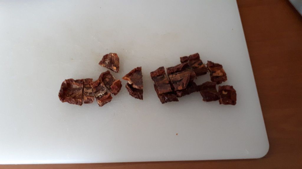 - Découper les tomates séchées en petits morceaux à l’aide de ciseaux de cuisine, découper les graines en morceaux à l’aide d’un couteau bien aiguisé.