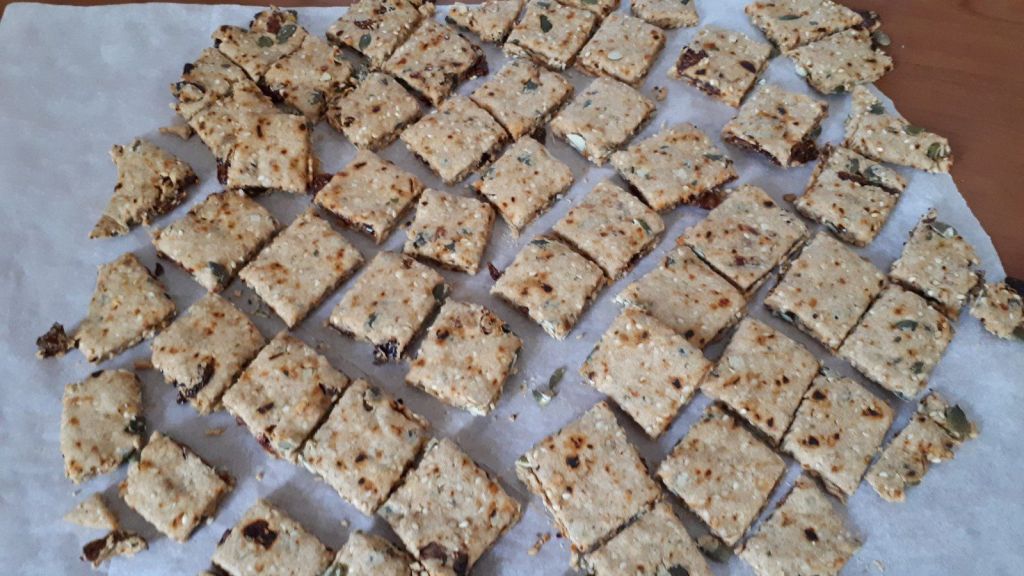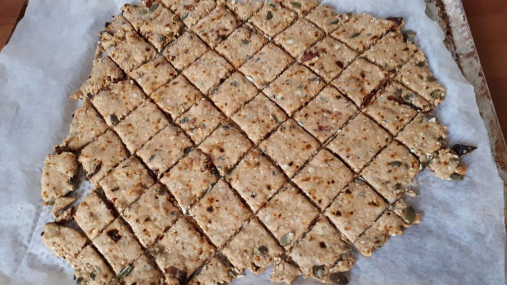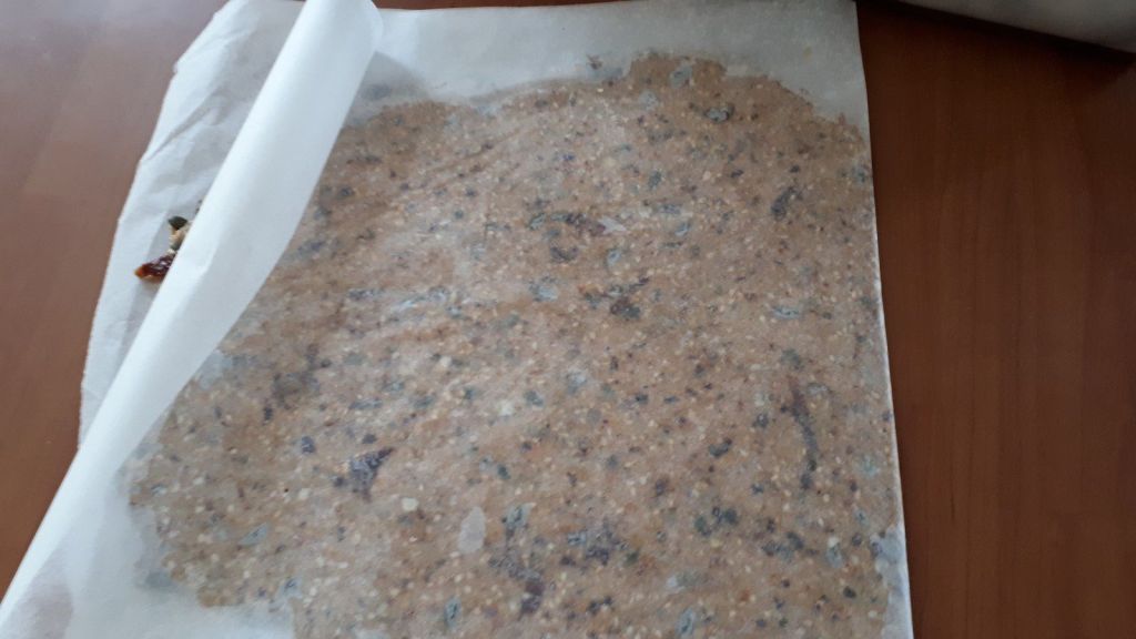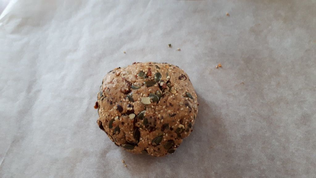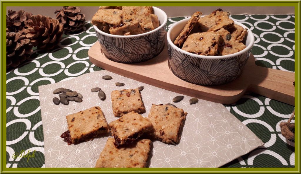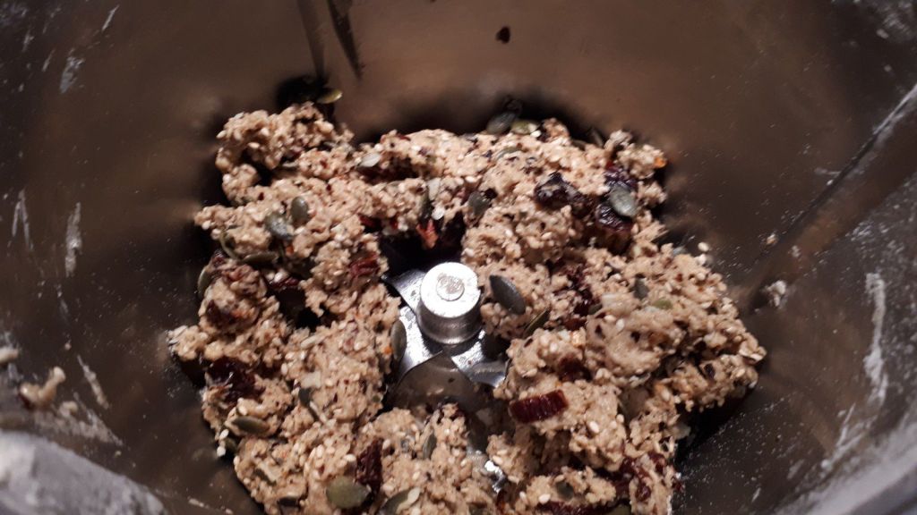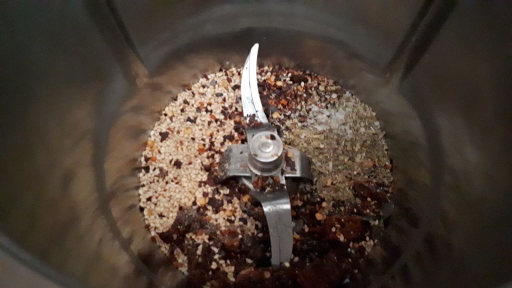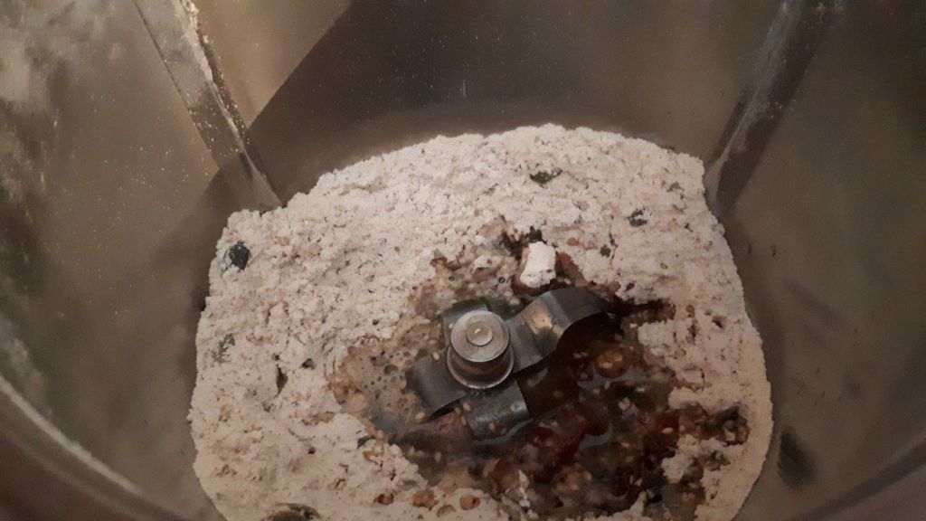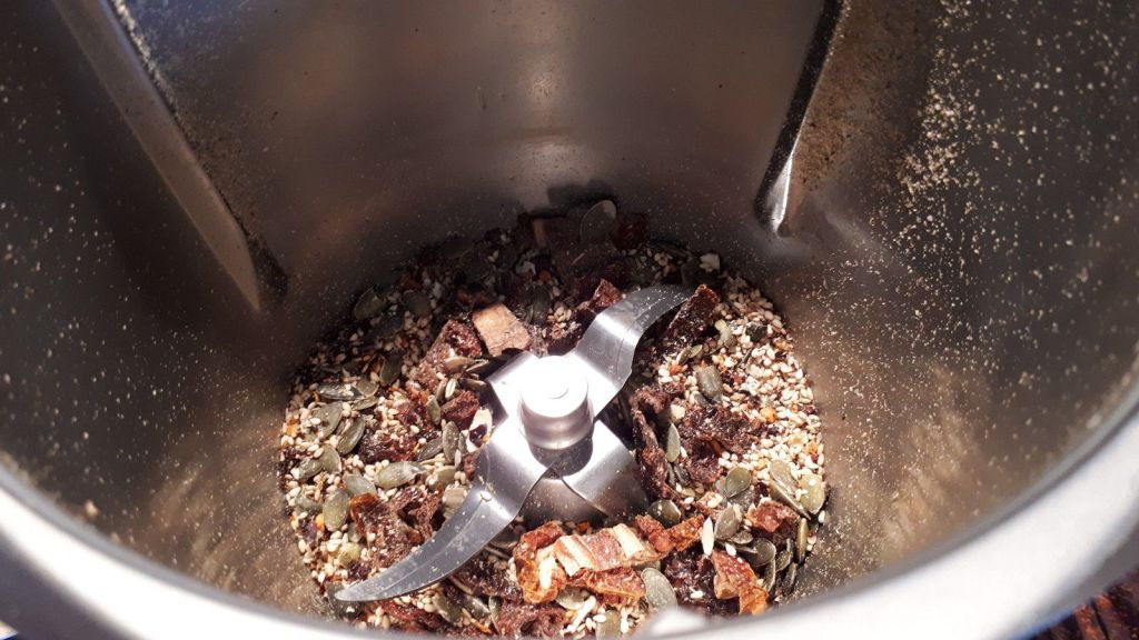 - Découper les tomates séchées en petits morceaux à l’aide de ciseaux de cuisine, les mettre dans le bol avec les graines de courge, les graines de sésame, l’origan, la fleur de sel, mélanger 4sec/vit5. Ajouter la farine et mélanger 20sec/vit3.