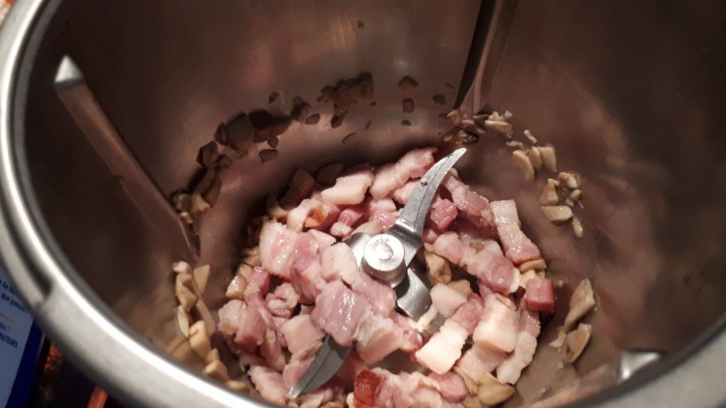 - Émincer vos pieds de champignons, puis les mettre dans le bol avec votre poitrine fumée que vous aurez coupée en lardons, faire chauffer 5min/120°C/couteau inversé/vit mijotage. Ajouter le miel, le persil ciselé, le poivre puis poursuivre la cuisson 3min/120°C/couteau inversé/vit mijotage.