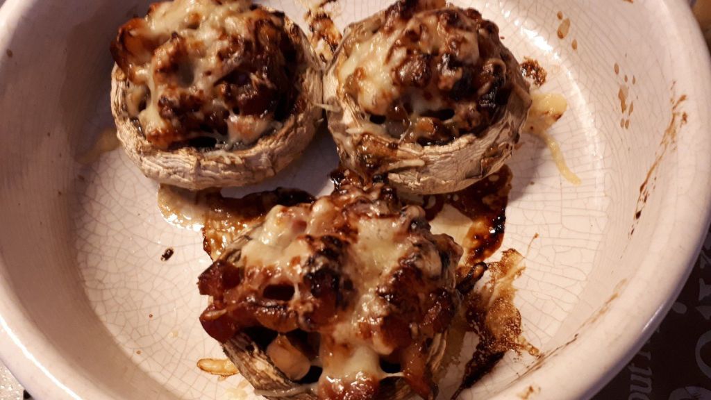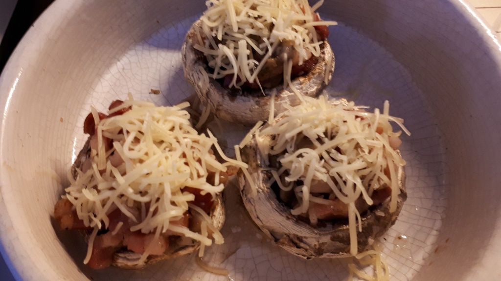 - Remplir les têtes de champignons avec votre préparation aux lardons, parsemer de Comté râpé puis faire chauffer à nouveau 20 minutes toujours à 180°C.