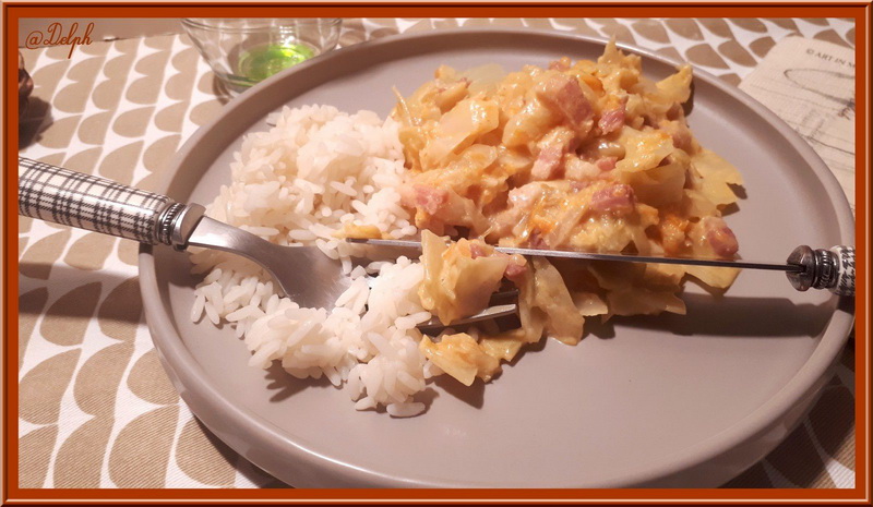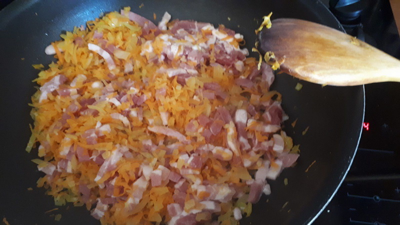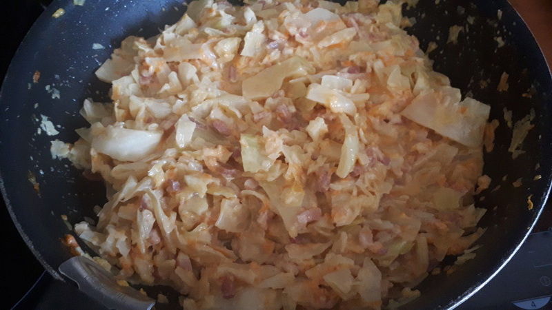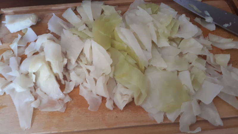 - Mélanger le chou coupé avec les lardons et l’oignon.