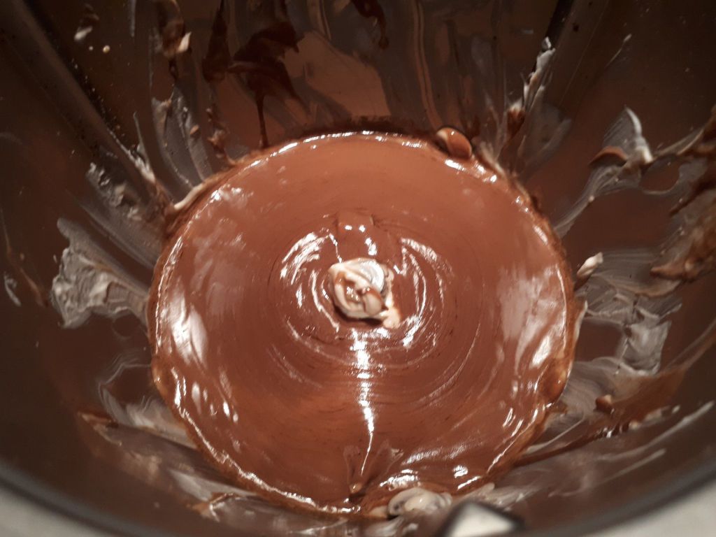 - Mettre le chocolat, la crème et le beurre puis faire chauffer 4min/60°CVit1, à la sonnerie racler les bords et continuer la cuisson 1min/60°C/vit1.