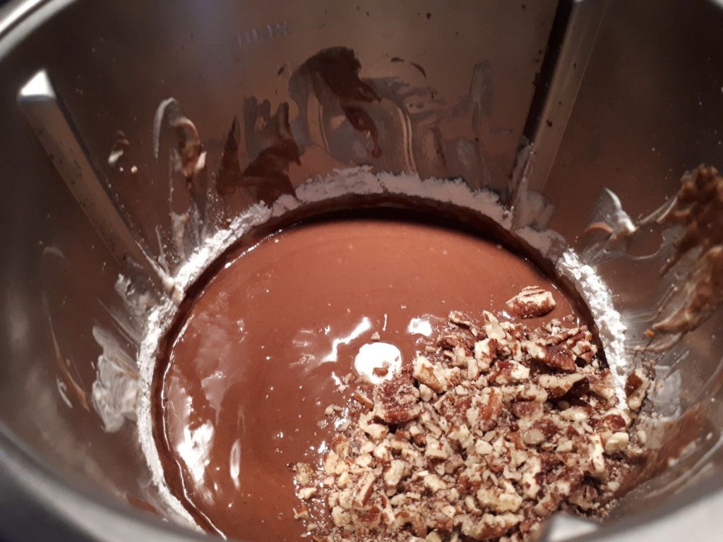 - Ajouter le sucre, la maïzena, l’œuf puis mélanger 30sec/Vit3, ajouter les noix pilées puis mélanger à nouveau 10sec/vit2.