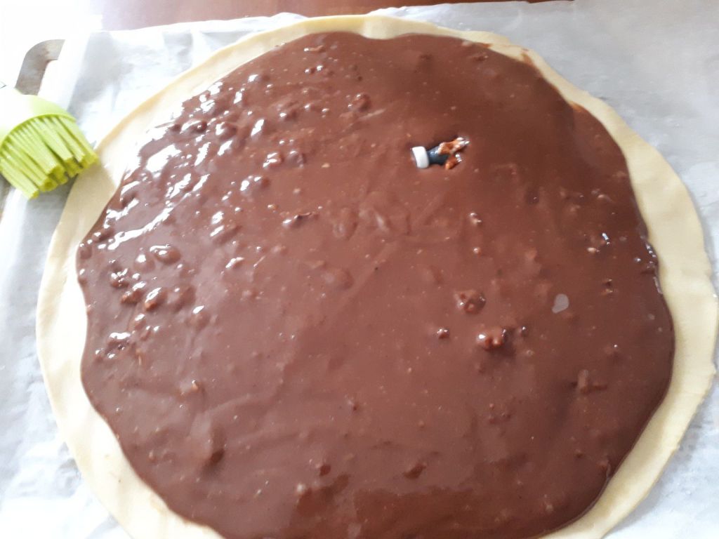 - Sur un papier de cuisson, étaler une pâte feuilletée, sur la grille allant au four, puis répartir la préparation au chocolat en vous arrêtant à environ 2 cm du bord.