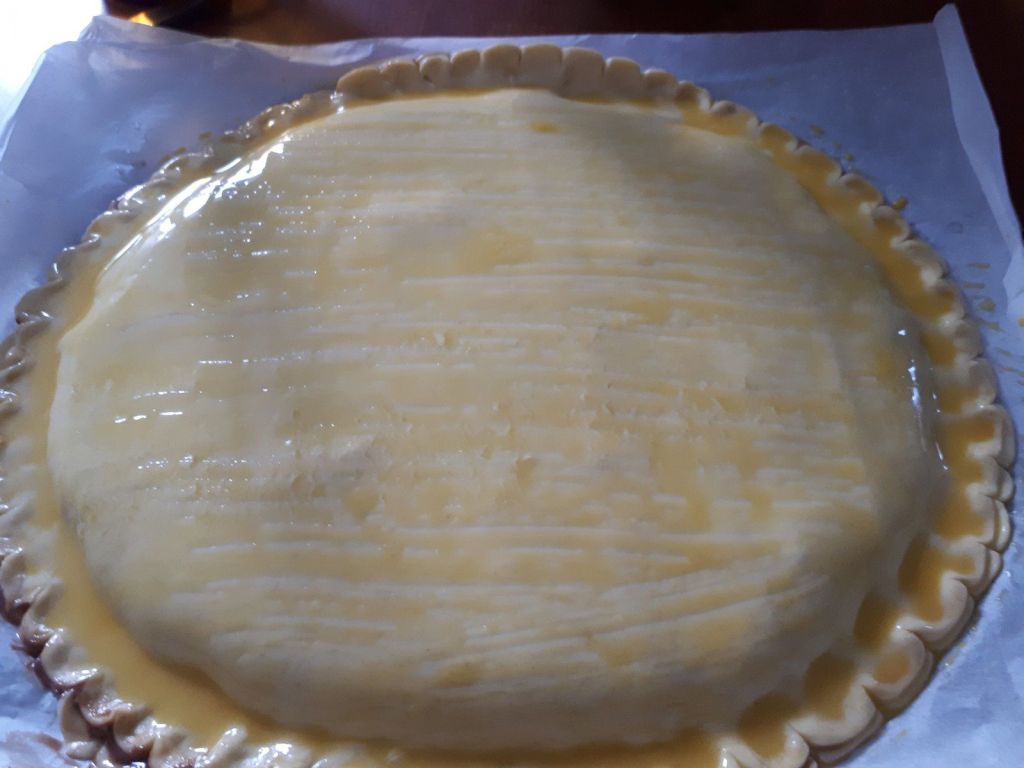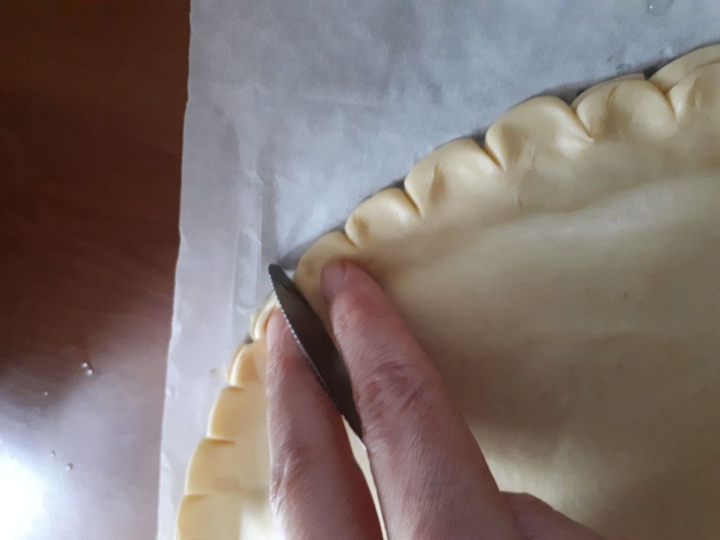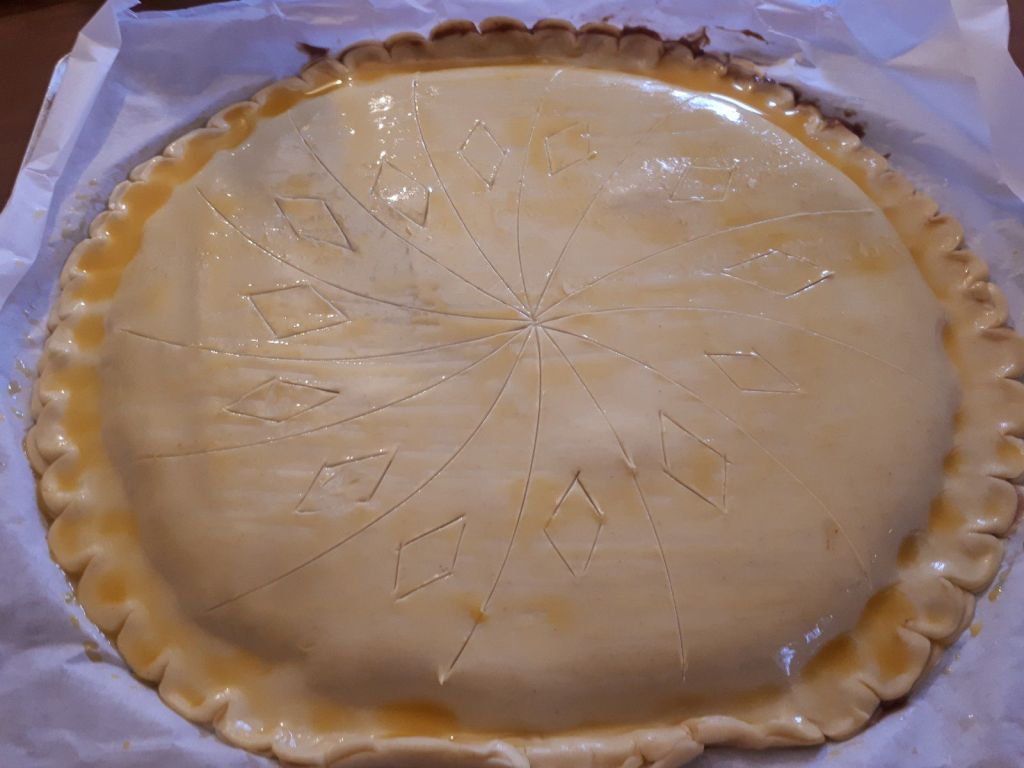 - Sortir votre galette et dessiner des stries au couteau avec une pointe fine sans trop appuyer pour ne pas couper la pâte.