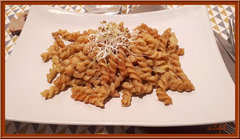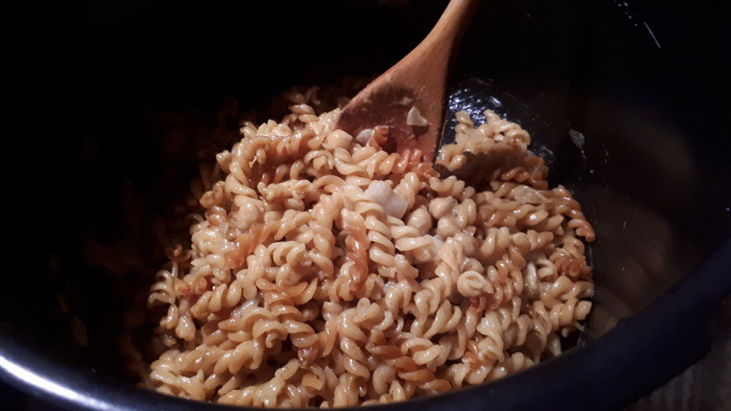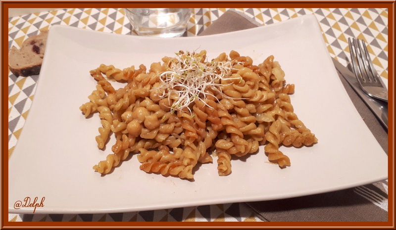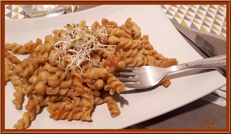 Je vous mets la recette pour la réaliser aussi à la casserole, je l’ai réalisée pour 2 personnes, pour 4 il suffira de doubler les doses des ingrédients, le temps de cuisson restera le même. J’ai utilisé des Torsades Lentille Corail achetées dans mon magasin Bio.