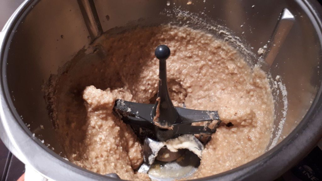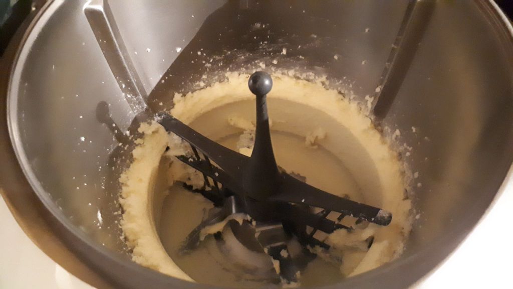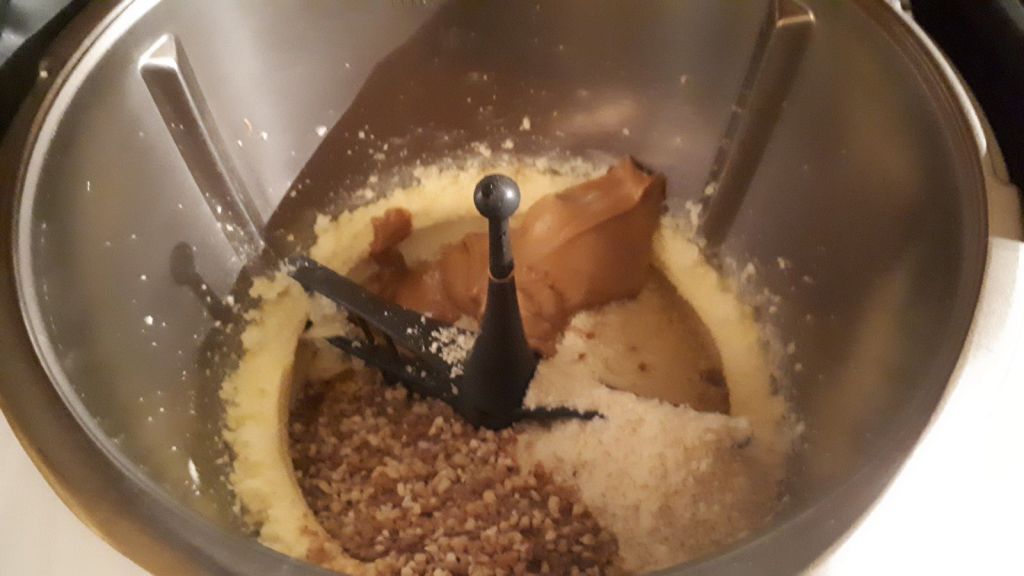 - Insérer le fouet puis mettre le beurre coupé en morceaux et le sucre fouetter 50sec/Vit3, ajouter les œufs, la poudre d’amande, la pâte de praliné, le pralin en grain puis fouetter à nouveau 15sec/couteau inversé/vit4.