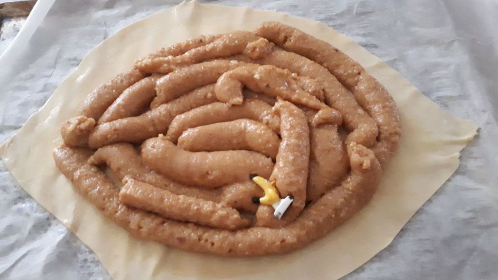 - Au bout de ce temps, disposer un cercle de pâte, déposer de la crème amande/pralinée sur le dessus en laissant 2 cm de pâte tout autour que vous mouillez légèrement avec un pinceau et de l’eau.