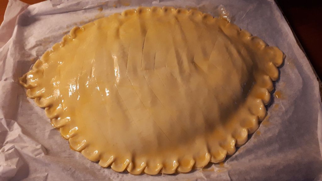 - Placer la fève et recouvrir avec le deuxième disque de pâte feuilletée légèrement plus grand, souder les bords en appuyant tout autour