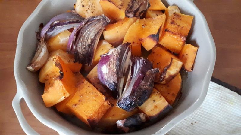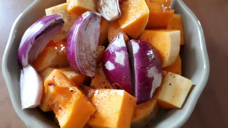 - Couper la courge en tranches d’environ 2 cm d’épaisseur et l’oignon et l’échalote en gros quartier.